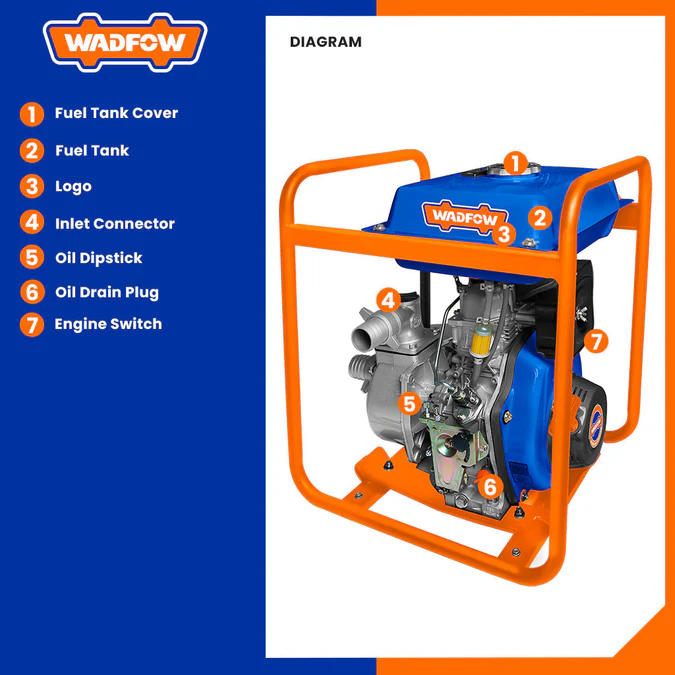Suction&Discharge port diameter:50mm,2″ Max.flow: 533L/min Max.head lift: 30m Max.suction head: 7m 4.5HP diesel engine Displacement: 247cc Fule tank: 12.5L Starting system: recoil Packed by carton box